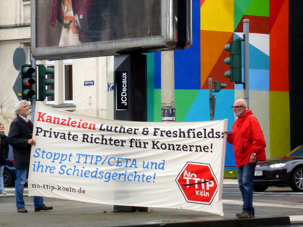 Köln, 9. Oktober 2014. Die Initiative No TTIP Köln protestiert bei widrigem Wetter gegen die Kanzlei Luther, die hier am Rheinauhafen an einer ungemütlichen Kreuzung ihren Sitz hat. In den geheimen Verhandlungen über TTIP und anderen Freihandelsabkommen werden Bestimmungen ersonnen und erörtert, mit denen Entscheidungen von Parlamenten als Handelshemmnisse von privaten Schiedsgerichten angefochten werden können. In diesem Sinne agieren schon jetzt international tätige Anwalts- und Wirtschaftskanzleien wie Freshfield und Luther. Die Kanzlei Luther verklagt im Auftrag des Energieriesen Vattenfall die Bundesregierung wegen des Atomausstiegs nach Fukushima auf 3,7 Milliarden Euro.